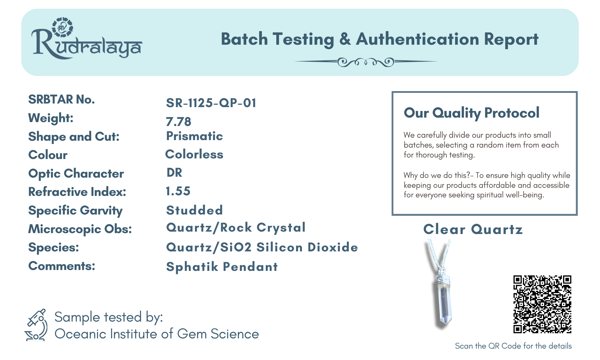Embrace the powerful healing energy of this Natural Clear Quartz (Sphatik) Pendant, known as the “Master Healer” in crystal therapy. Clear Quartz is believed to amplify energy, balance the chakras, and promote mental clarity, making it an essential crystal for spiritual growth and protection.